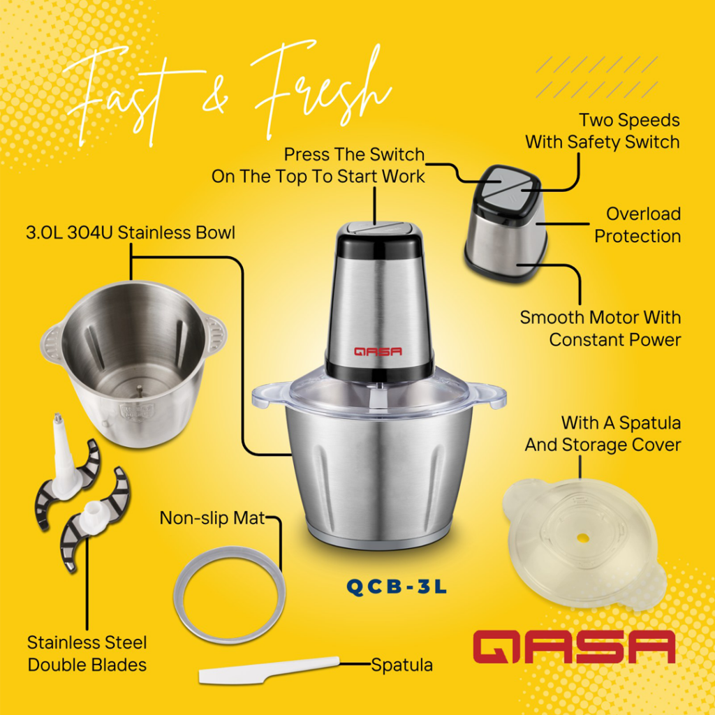 The QASA Chopper Blender QCB-3L Stainless is engineered for efficient performance, combining functionality and convenience to handle a variety of chopping and blending tasks. Equipped with a high-quality 350W motor and durable stainless steel blades, it efficiently processes ingredients to desired consistencies. The 3.0L stainless steel bowl provides ample capacity for preparing meals in substantial quantities. With a safety switch and overload protection, this appliance offers secure and reliable operation to suit various culinary needs.
